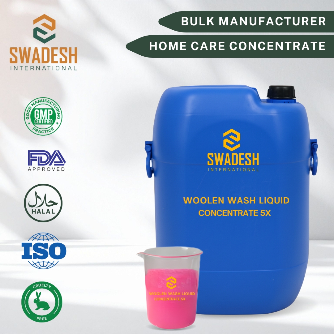 Swadesh International is a trusted Woolen Wash Liquid Concentrate Manufacturer, offering high-quality formulations designed for gentle yet effective cleaning of woolen and delicate fabrics. Our woolen wash liquid concentrate is developed using mild surfactants and fabric care agents that help remove dirt and stains while preserving fabric softness, texture, and color. The formulation ensures low foam generation and easy rinsing, making it suitable for both hand wash and machine wash applications. Manufactured under strict quality control processes, our woolen wash concentrate provides consistent performance and stability, making it ideal for textile care product manufacturers and private label brands.